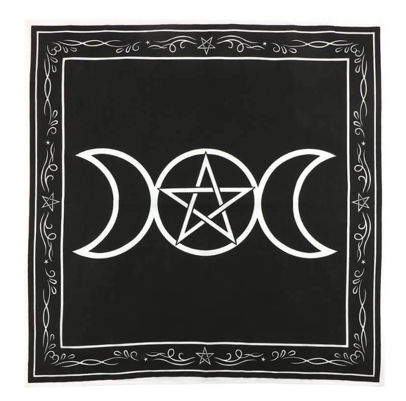 Channel the power of the mother, maiden and crone with this cotton altar cloth with printed triple moon and pentagram design. A flourished white border finishes off this contemporary style.