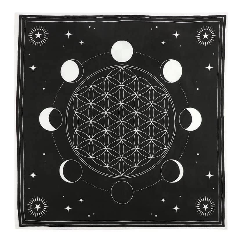 Channel the powerful energy of crystal healing with this cotton altar cloth with printed moon phase design and Flower of Life crystal grid printed in its center. Perfect for arranging crystals and clearing the mind.